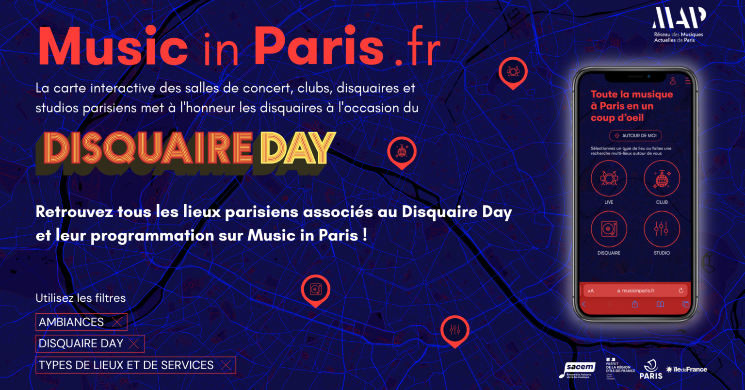 Music in Paris s’associe au Disquaire Day pour la journée du 22 avril ! Tous les lieux parisiens associés à cet événement et leur programmation sont désormais disponible sur Music in Paris – la seule plateforme web gratuite qui présente sur une carte géolocalisée les salles de concerts, clubs et leurs programmations, mais aussi les studios et les disquaires.