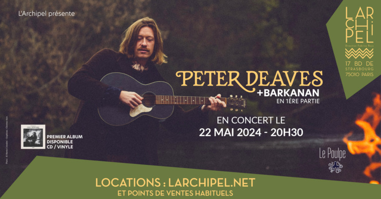 Peter Deaves en concert mercredi 22 mai à L’Archipel ! Infos L’Archipel présente : PETER DEAVES + BARKANAN en première partieMERCREDI 22 MAI À 20H30CONCERT : FOLKSALLE…