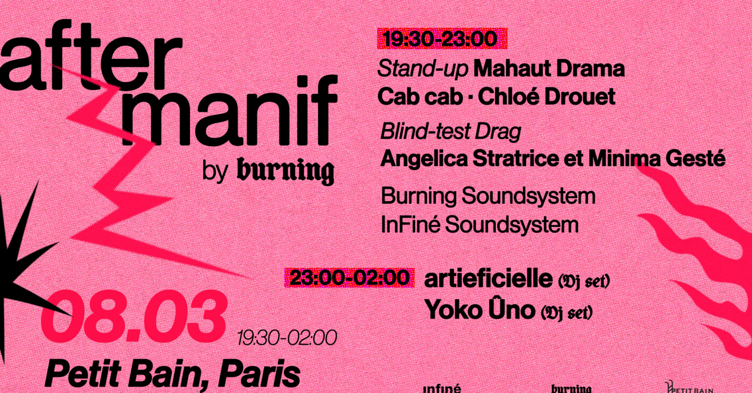 Câest pour cette raison que Burning Womxn investit Petit Bain (13e) ce jour, pour une soirĂ©e « after-manifestation », pensĂ©e comme un espace de ralliement et de rĂ©sistance pour tous.tes celles et ceux qui partagent des valeurs d’Ă©galitĂ© et de justice sociale. Sous le signe de lâintersectionnalitĂ© et lâinclusion, nous invitons le public Ă explorer la maniĂšre dont les arts, l’humour et la culture queer se mettent au service des luttes sociales.Â