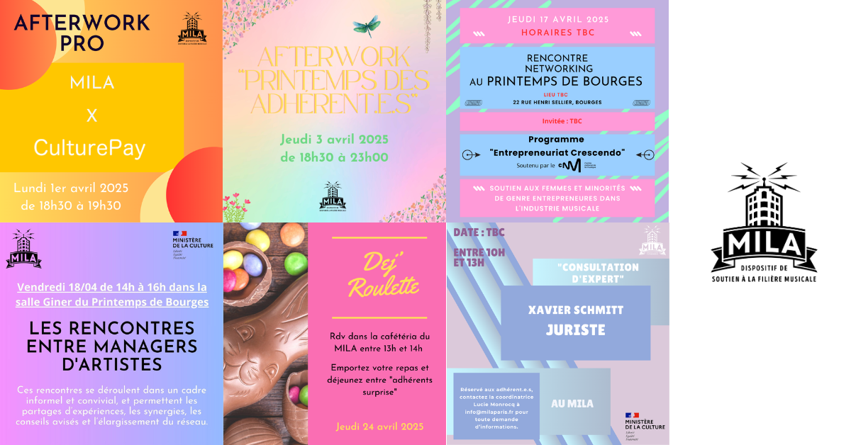 - 01/04 : Afterwork « MILA x CulturePay », animé par Marylou Ainsa et Samuel Buresi-Lang. Accès adhérent.e.s MILA & invité.e.s.