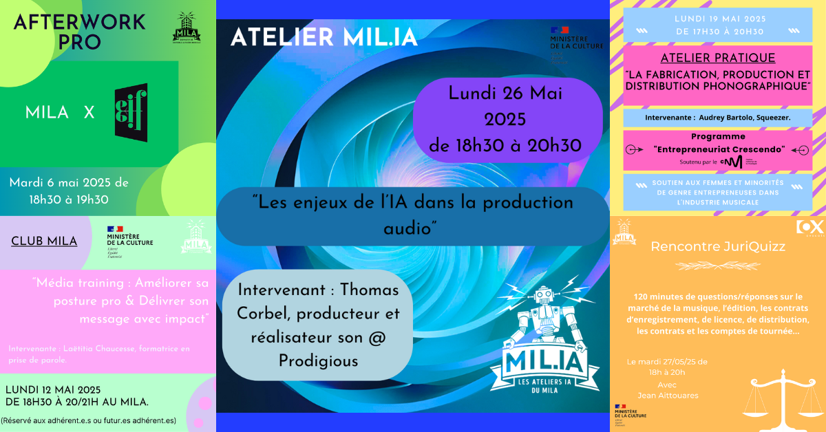 - 26/05 : Atelier MIL.IA « Les enjeux de l’IA dans la production audio », animé par Thomas Corbel. Accès adhérent.e.s MILA.
