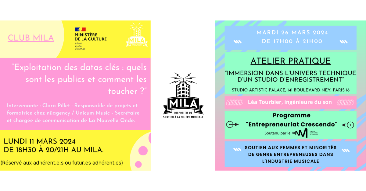 - 11/03 : « Club MILA – Exploitation des data clés : quels sont les publics et comment les toucher ? » animé par Clara Pillet, Responsable de projets et formatrice chez Nüagency / Unicum Music & Secrétaire et chargée de communication de La Nouvelle Onde. Accès aux adhérent.e.s MILA et Réseau MAP.