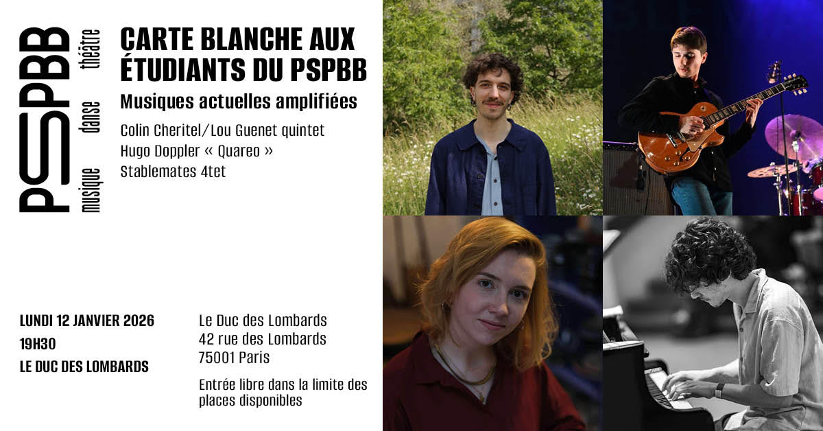 Les étudiants en DNSPM parcours Musiques actuelles amplifiées (MAA) du PSPBB présentent leur projet personnel au Duc des Lombards. Trois projets se succèderont sur scène le lundi 12 janvier 2026 à 19h30 : Colin Cheritel/Lou Guenet quintet, Hugo Doppler « Quareo » et Stablemates 4tet.