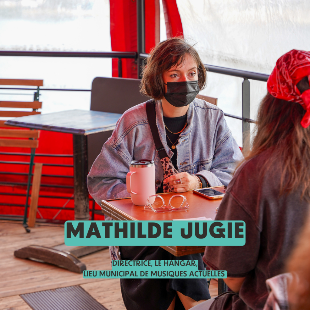 Mathilde Jugie est directrice du Hangar, lieu municipal de musiques actuelles à Ivry sur Seine. Diplômée de Sciences Po Bordeaux, elle a d’abord exercée comme administratrice des Ateliers Frappaz (Centre National des Arts de la Rue à Villeurbanne) et leur festival Les Invites. Elle rejoint en 2016 l’équipe de Zebrock, d’abord comme administratrice puis comme secrétaire générale, en charge notamment du pilotage des finances et de l’administration, de la communication, et du volet accompagnement artistique et soutien à la création porté historiquement par la structure (avec notamment Le Grand Zebrock, la Scène Zebrock de la Fête de l’Humanité, les Scènes Zebrock). En 2021 elle intègre la deuxième proportion de Wah, dispositif de mentorat féminin porté par la Fedelima. Depuis 2023 au sein du Hangar, comme responsable du pôle publics puis comme directrice, elle s’emploie à creuser le sillon tracé par la structure depuis 37 ans, où se déploient depuis 37 ans activités de diffusion, d’accompagnement des pratiques musicales, pour les amateurs comme pour les professionnels, avec un attachement fort à l’autonomie, l’indépendance et l’émancipation de toustes.