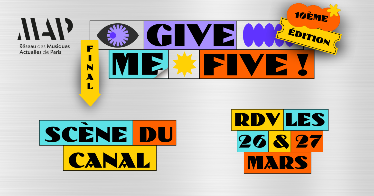 Le Réseau MAP vous donne rendez-vous les 27 et 28 mars à la Scène du Canal pour assister à la finale live de GIVE ME FIVE! 2024 ! Pour fêter les 10 ans, GIVE ME FIVE! propose également des rencontres sur les deux journées : on vous dit tout dans cet article ↓