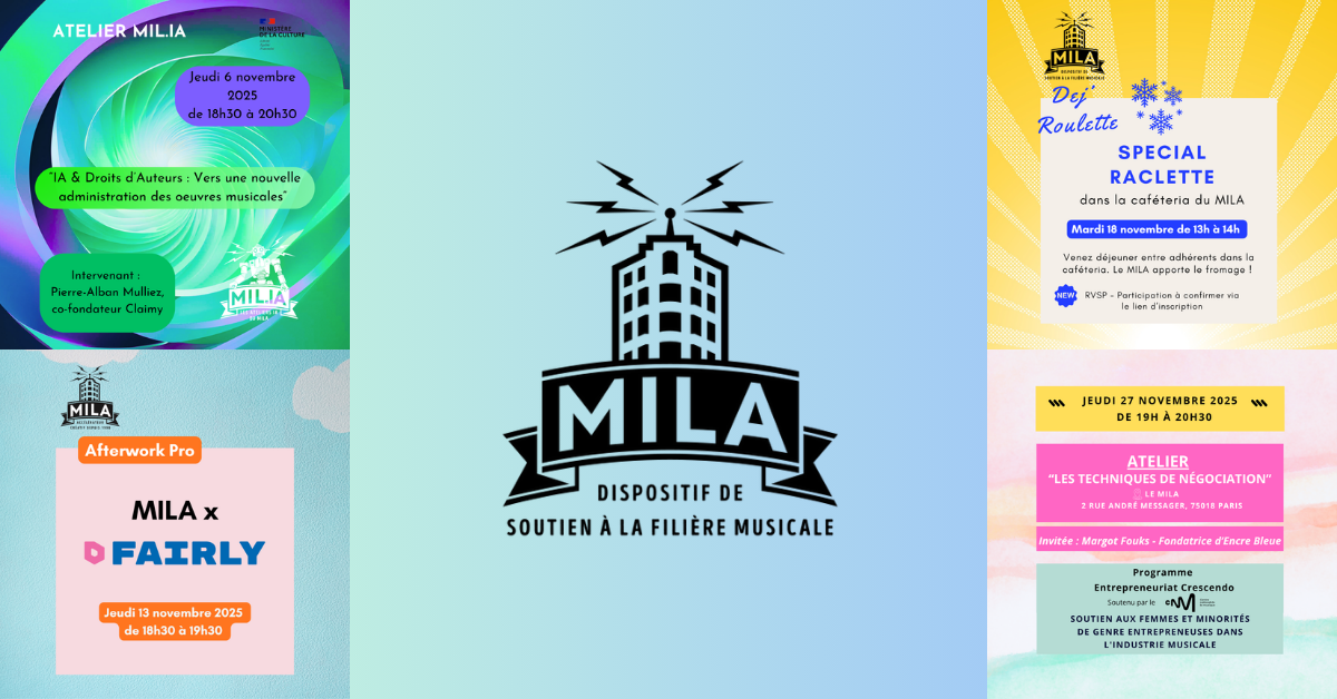 - 06/11 : Atelier « MIL.IA IA & Droits d’Auteurs : Vers une nouvelle administration des œuvres musicales”. Accès adhérent.e.s MILA.