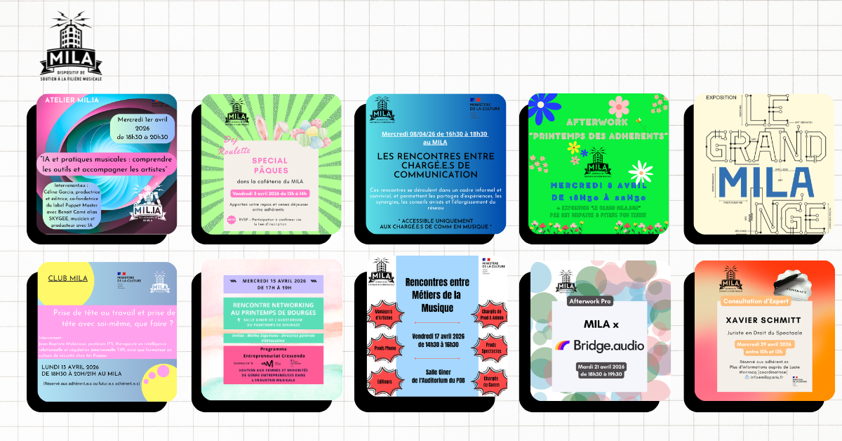 Avril est là, et avec lui une avalanche d’événements signés MILA ! Ce mois-ci nous vous proposons un programme bien rempli avec notamment : une Rencontre entre Chargé.e.s de Comm, l’Afterwork “Printemps des Adhérent.e.s”, le vernissage de l’exposition “Le Grand MILA.NGE”, une Rencontre Networking avec Malika Séguineau directrice d’Ekoscènes et des Rencontres entre Métiers de la Musique au Printemps de Bourges, un Club MILA sur le bien-être au travail ainsi qu’un Afterwork Pro avec Bridge.audio, et pour terminer des Consultations d’Expert avec un juriste en droit du spectacles !