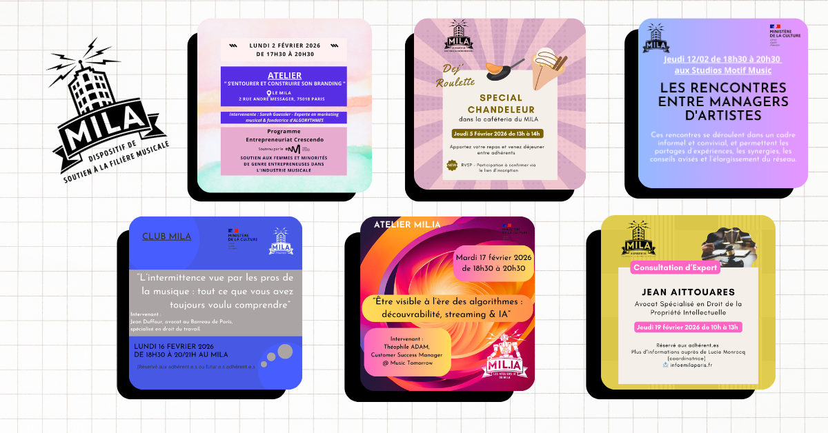- 17/02 : Atelier MIL.IA “ Être visible à l’ère des algorithmes : découvrabilité, streaming & IA ” Animé par Théophile Adam Customer Success Manager @ Music Tomorrow. Accès adhérent.e.s MILA.