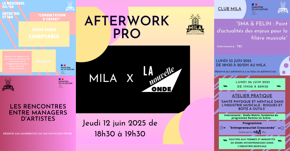 Le mois de juin s’annonce chargé au MILA : une Consultation d’Expert avec un comptable, un afterwork avec La Nouvelle Onde ou encore une Rencontre entre Managers d’Artistes. Ces opportunités couvrent des sujets variés, offrant aux adhérent·e·s des occasions uniques de développement dans le domaine musical.