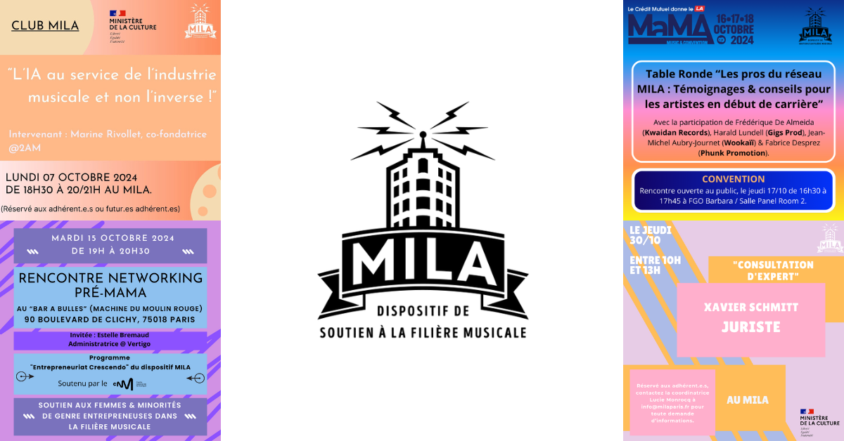 17/10 : Table Ronde au MaMA « Les pros du réseau MILA : Témoignages & conseils pour les artistes en début de carrière », avec la participation de Frédérique De Almeida (Kwaidan Records), Harald Lundell (Gigs Prod), Jean-Michel Aubry-Journet (Wookaïï) & Fabrice Desprez (Phunk Promotion). Rencontre ouverte au public.