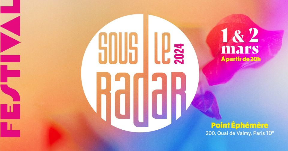 L’association Sous le Radar, en coréalisation avec Point Éphémère, proposera vendredi 1er et samedi 2 mars 2024 la deuxième édition de son festival de musique, qui réunira 12 artistes, à travers 8 concerts et 4 DJ sets. Ce festival est porté par la volonté de faire découvrir de jeunes artistes de genres musicaux variés (électro, folk, jazz, musique instrumentale, pop, rap, rock…).