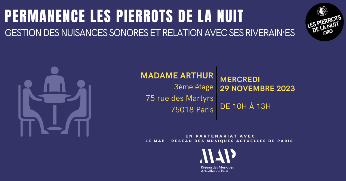 Vous rencontrez des problématiques liées à la gestion sonore de votre établissement ? Isolations phoniques, horaires, relations de voisinage… Venez échanger avec Les Pierrots de la Nuit, le Mercredi 29 Novembre entre 10h et 13h à salle du 3 ème étage chez Madame Arthur (75 rue des Martyrs, 75018 Paris), pour un suivi gratuit, confidentiel et personnalisé de votre situation. Nous proposons un large éventail d’actions : documentation, gestion des flux de clientèle, sensibilisation auprès des riverain·es et du public festif à l’aide d’outils de médiation adaptés à vos besoins.