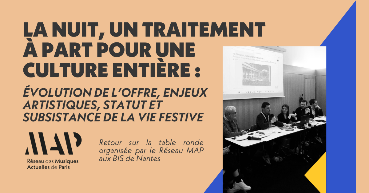 Dans le cadre des BIS de Nantes 2023, le Réseau MAP a eu l’opportunité d’organiser une table ronde sur la thématique “La Nuit, un traitement à part pour une culture entière : évolution de l’offre, enjeux artistiques, statut et subsistance de la vie festive”. Table ronde modérée par la coordinatrice des Nuits du Futur, Chloé Bihan, et avec la participation de Renaud Barillet, président du Réseau MAP et fondateur-DG du réseau d’établissements Cultplace ; Thibaut Guiné, membre du conseil métropolitain & conseiller municipal, élu de quartier Centre-ville à la Mairie de Nantes ; Vicente Pizcueta, chargé de communication de l’association Noche Madrid, Lorenzo Serra, le co-fondateur du Listen Festival et président de la Brussels By Night Federation ainsi que Frantz Steinbach, vice-président du Réseau MAP et Trésorier des Pierrots de la Nuit.