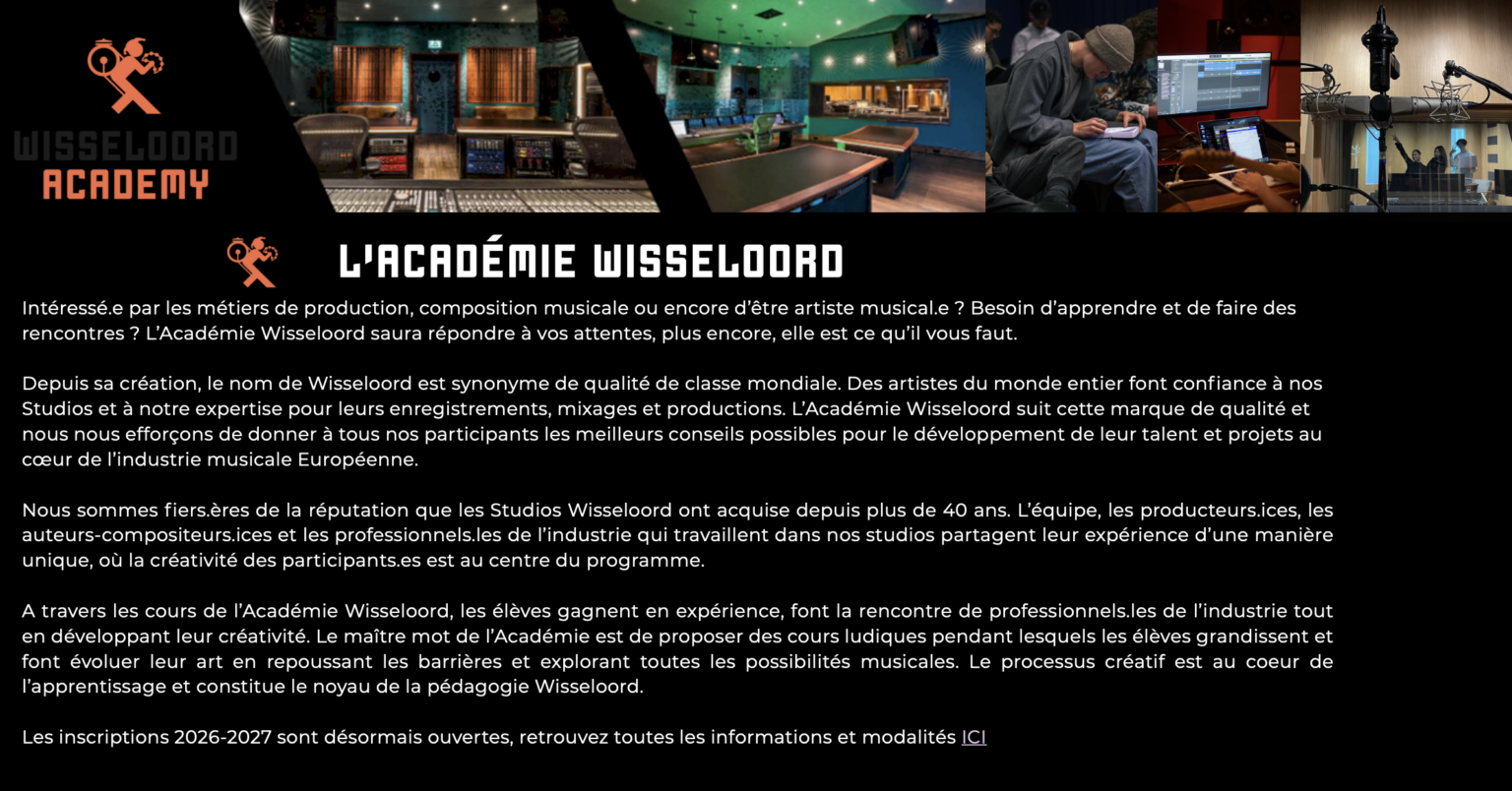 Intéressé.e par les métiers de production, composition musicale ou encore d’être artiste musical.e ? Besoin d’apprendre et de faire des rencontres ? L’Académie Wisseloord saura répondre à vos attentes, plus encore, elle est ce qu’il vous faut.